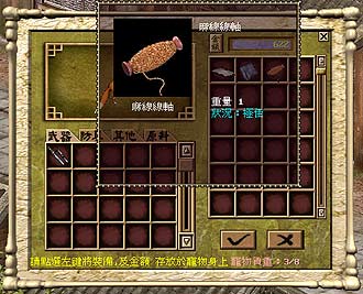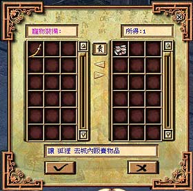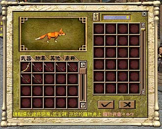 * 玩家在请Q宝帮忙贩卖物品之前,须要先使用“载重”指令,将欲贩卖的物品放置在Q宝身上,此一介面左方栏位会显示Q宝目前身上的装备物品,按滑鼠左键点选欲贩卖的物品,该物品将跳至右方栏位,此时再打勾确定,Q宝就会自动去城内帮玩家贩卖该物品。