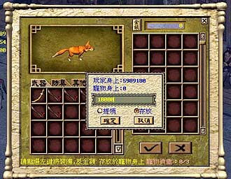 按下“载重”选项,玩家可以将身上的装备或是金钱寄放在Q宝身上,系统会显示宠物目前负重和金钱的数目,如果宠物身上尚未放置金钱,点选介面右上角的“金额”指令,玩家就可以将身上的钱存放在Q宝身上啰!玩家只要输入一笔金额,点选“存放”,就可将钱寄放在Q宝身上,如果想把钱从Q宝身上拿回来,只要再输入金额,点选“提领”就可以了,非常简单方便。Q宝身上可寄放的最高金额为100万元,玩家在请Q宝代为购买、寄物时,记得要先把足够的钱放在Q宝身上,如果玩家要把Q宝寄放给Q宝商人照顾时,也要记得先把Q宝身上的钱提出来才能寄放喔!
