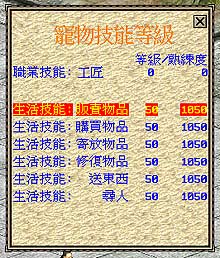 * 点选“技能”指令键,进入Q宝生活技能状态介面,介面中会显示Q宝目前六种生活技能的熟练度和等级,玩家可以选择其中一项生活技能让Q宝执行,这里点选“贩卖物品”生活技能后,会进入下一个介面。