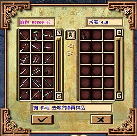 * 介面中间方格也会显示“买”、“卖”、“寄”、“修”、“送”、“寻”等生活技能,玩家可按下方的左右键来更换生活技能的选项介面,这里进入购买的介面中,栏位左方为可购卖的物品一览表,按左键点选欲购买的物品,该物品会跳至右方栏位,再打勾确定即可。