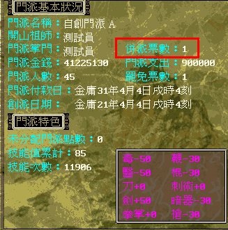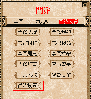 受邀请合并的自创门派,开始进行投票的动作。同意并派的人数须达到门派总人数的1/2以上。 |